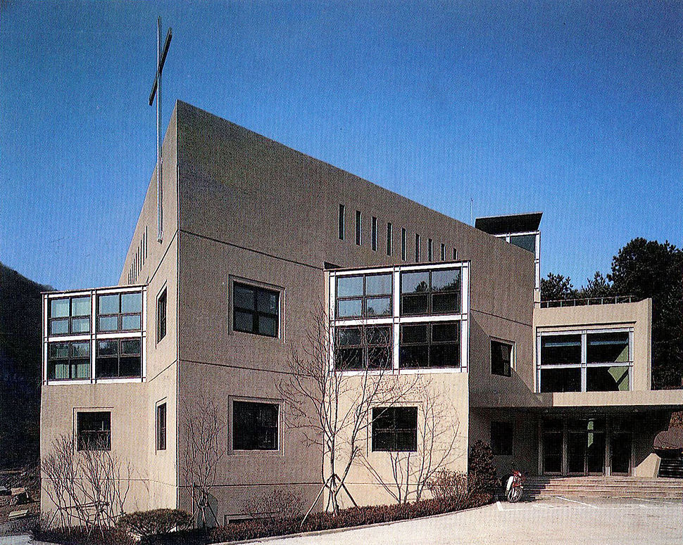 좁은 산길을 스치며 올라간 남향의 산기슭, 계곡속에 아늑하게 자리잡은 대지중 사용할 수 있는 부분은 그리 넓지 않았다. 앞으로는 계곡물이 흐르고 그건너 산기슭에 밤나무밭이 보이는 그곳에 내가 할수있는 일이란 무엇일까.아름다운 자연환경에 서툴은 솜씨로 메스를 대는것을 하나님은 과연 용납할 것인가.대지가 한눈에 조망되는 건너편 산기슭에 서서 땅을 딛고 솟아오를 새로운 하나님의 성전을 그려보았다.